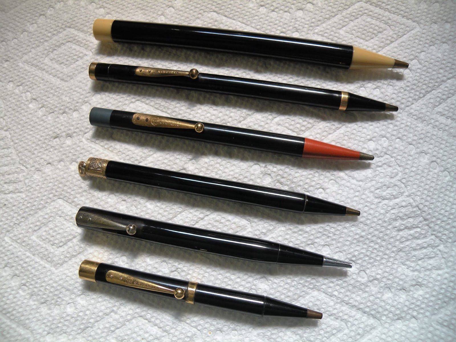 I'm showing a grouping of Onoto mechanical pencils inspired by my friend Myk from here in this Facebook group. Onoto is a British company which has recently seen a rebirth. Very nice new production fountain pens are available today. Back to Myk, his Onoto pencil is second from the right in my picture. Thanks! The pictured Onoto's were produced from the 1930's into the early 1940's. Picture includes a nice German Steno pencil (circa around 1935). It kinda snuck into the shot. The Steno is a nicely chased repeater (push activated). The Onoto's are all twist mechanisms. Onoto's were also produced in Australia. The far left pencil is so marked 'Made In Australia'.