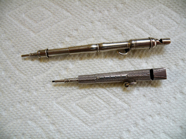 Pencils as musical instruments here. Two Sampson Mordan mechanical pencils represented as the larger recorder and smaller flute. The writing units are deployed telescopically by the recorder and by twist action with the flute. Material is sterling silver on both pieces. Circa 1885. The larger recorder is 2 3/4 inches long in the closed position and 3 3/4 inches extended. The flute closed is 2 1/8 inches long and extended 1 3/4 inches. Classical music anyone?