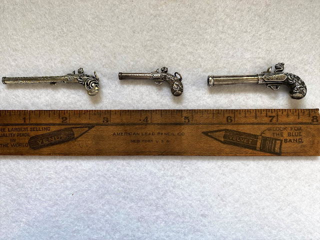 Three silver buccaneer pistol figurals. Circa 1840s. The two larger pieces are mechanical pencils. The smallest of the three is a toothpick. The working ends are deployed by pushing the pistol triggers along underside channels. The toothpick and right-side pencil were produced by Sampson Mordan of England. The left pencil is an unmarked noname.